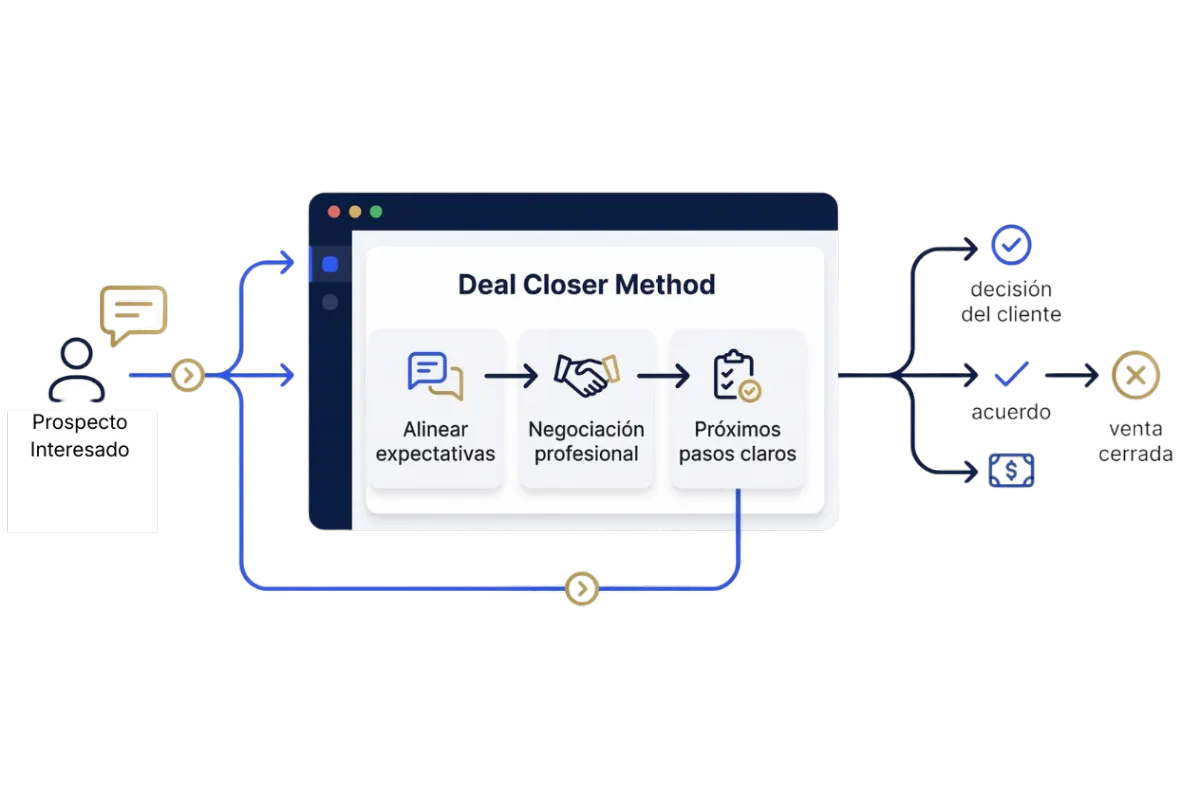 Deal Closer te enseña una estructura simple para llevar cualquier conversación de ventas hasta una decisión clara del cliente.