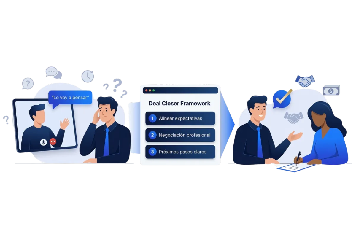 Obtén el entrenamiento completo para cerrar con acuerdos claros, negociar sin regalarte y salir con próximos pasos definidos.